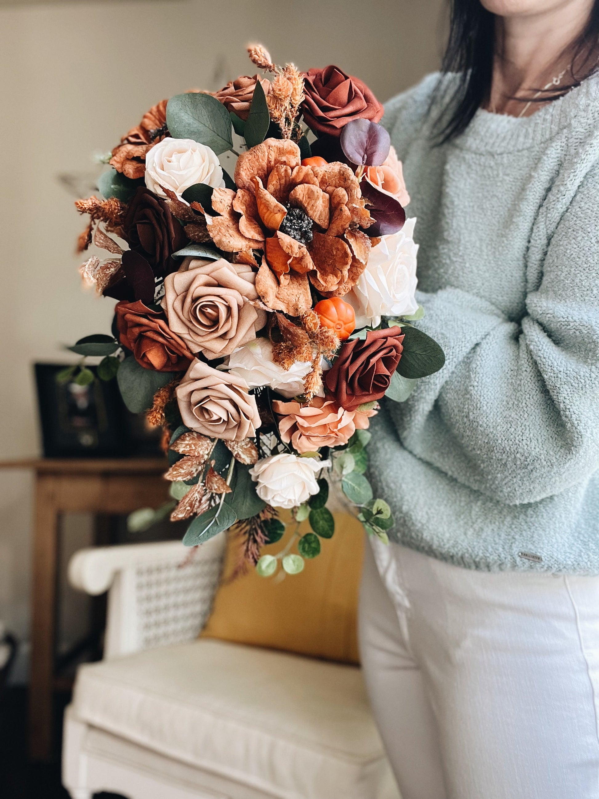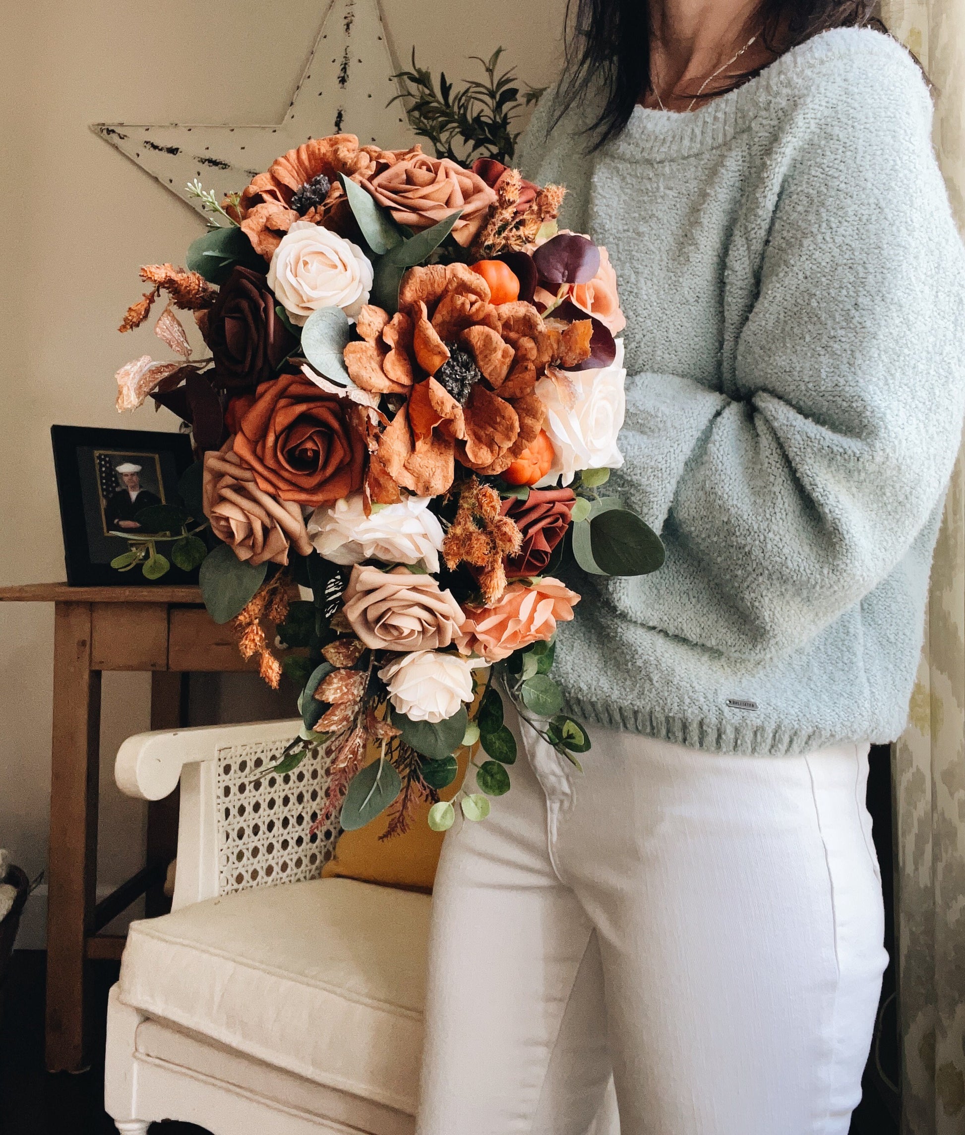 The beauty of this bouquet lies in the rich, warm hues of terracotta, brown, and taupe. These colors effortlessly capture the essence of fall and the romantic mood of your special day. The bouquet cascades beautifully, creating a visually stunning effect that adds a dramatic touch to your bridal look.