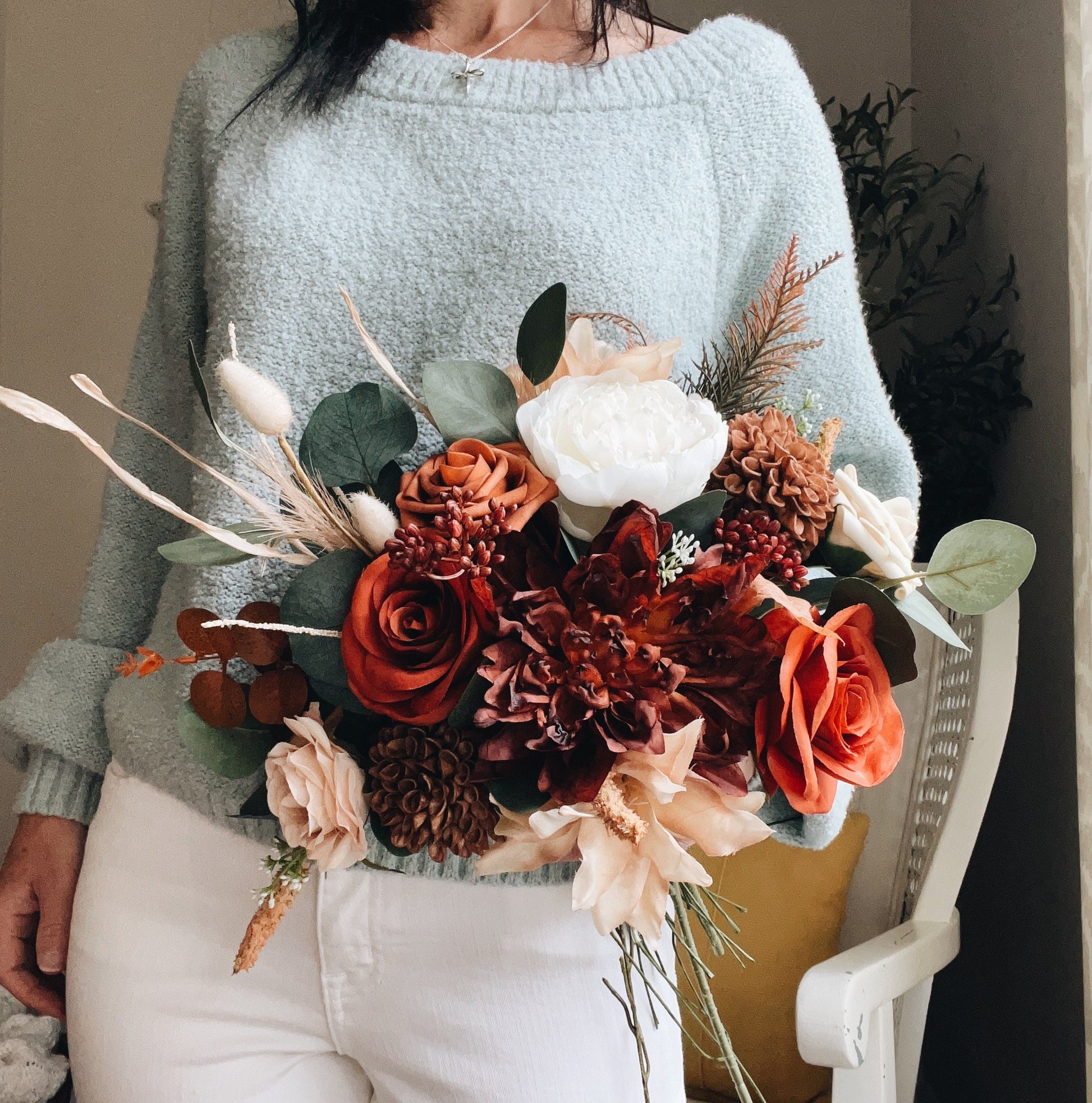 Our Rust Orange Fall Bridal Bouquet is an exquisite blend of high-end artificial florals and greenery, designed to perfectly complement the rich, warm hues of the autumn season. Each bouquet is carefully handcrafted with attention to detail, ensuring a unique and stunning accessory for your special day.