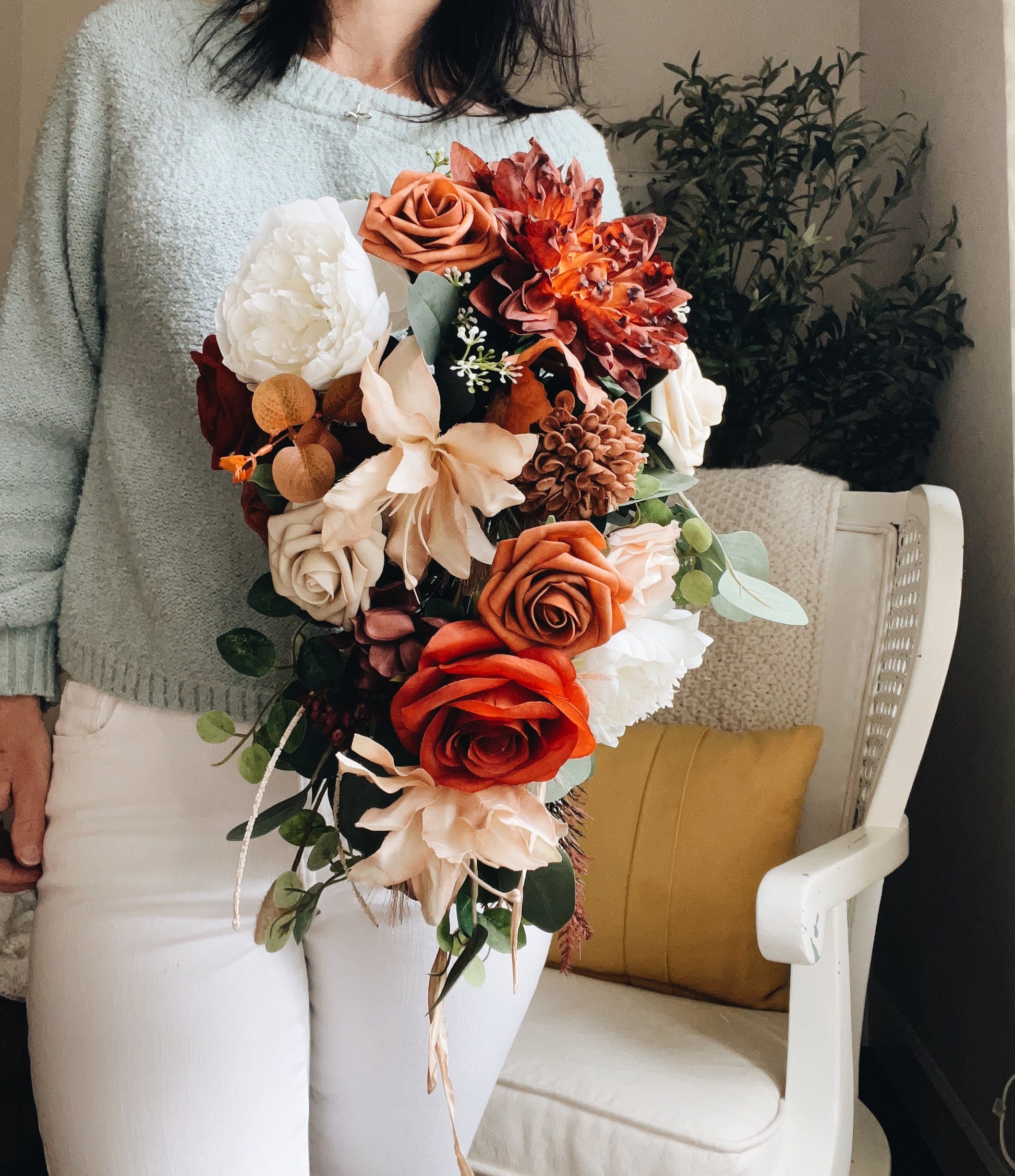 Fall Late Summer Bridal Bouquet Cascading Flowers for Wedding Rust Orange Beige