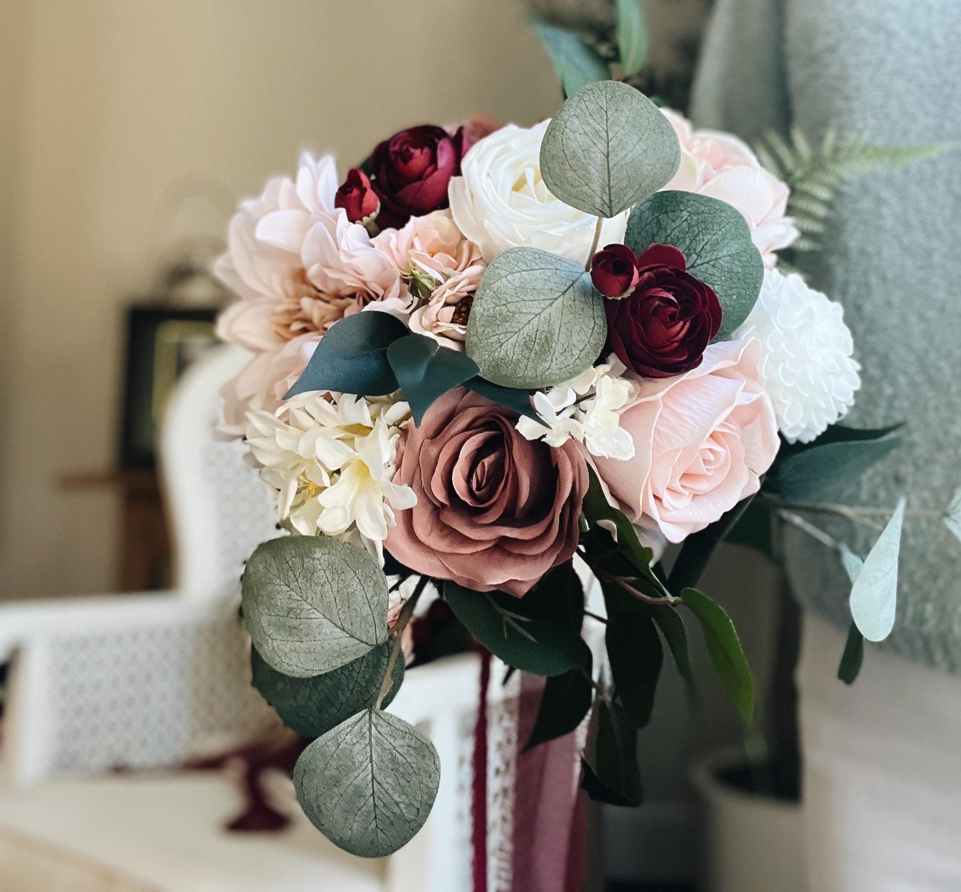 Make your wedding day magical with this exquisite 14”-16” bridal bouquet! Handcrafted with love, this stunning arrangement features a soft blend of blush, burgundy, and white roses and dahlias, accented with lush greenery and a chic burgundy ribbon. Perfect for brides, bridesmaids, or as a timeless decor piece, this bouquet radiates romance and sophistication.