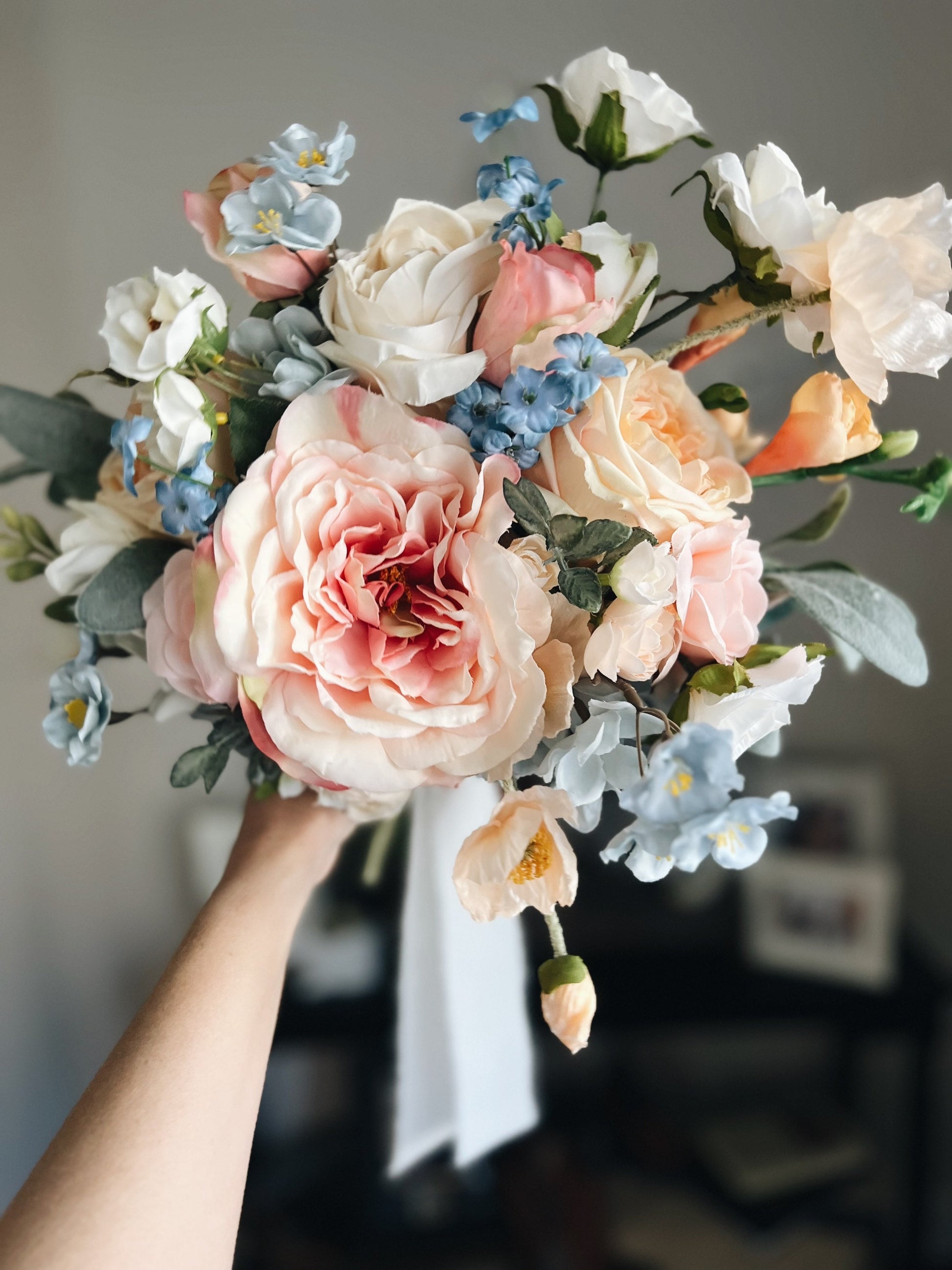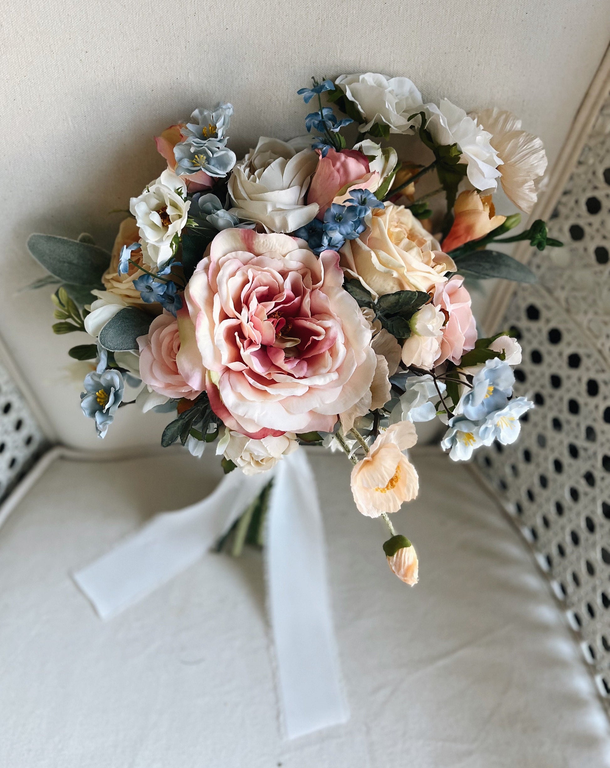 Made with high end florals and inspired design by English cottage gardens, this bouquet is 14” wide and ready to stun your guests and make your day extra beautiful. The most beautiful hued pastel blues, pinks, peaches and creams and hand tied with your favorite ribbon color.